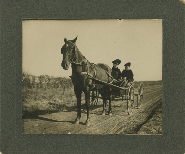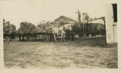 | Summer 1907, taken by Miss Logstong at Geo Longs. William P Gallaher's team hitched to load of corn. Jack and Walter. Jack died June 20. |