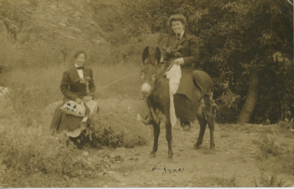photo is stamped 1910, Denver, Colorado. The donkey's name is